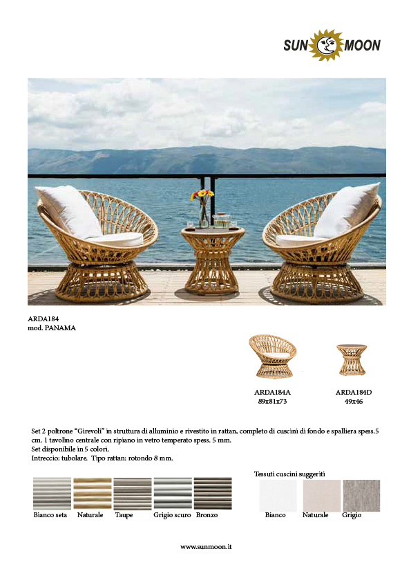 2 set "Swivel" in aluminum frame and covered in rattan, complete with trails and back 5 cm thick. 1 coffee table with tempered glass top thickness. 5 mm.