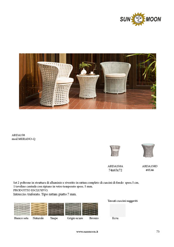 2 armchairs set in aluminum frame and rattan covered cushions full bottom and back 5 cm thick. 1 coffee table with tempered glass top thickness. 5 mm.