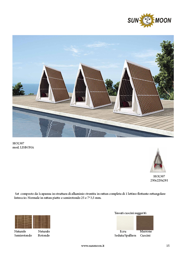 Set includes 1 aluminum frame hut covered in rattan sunbed 1 complete rectangular floating 10 loose cushions. 1 coffee table with tempered glass top, 5 mm thick.