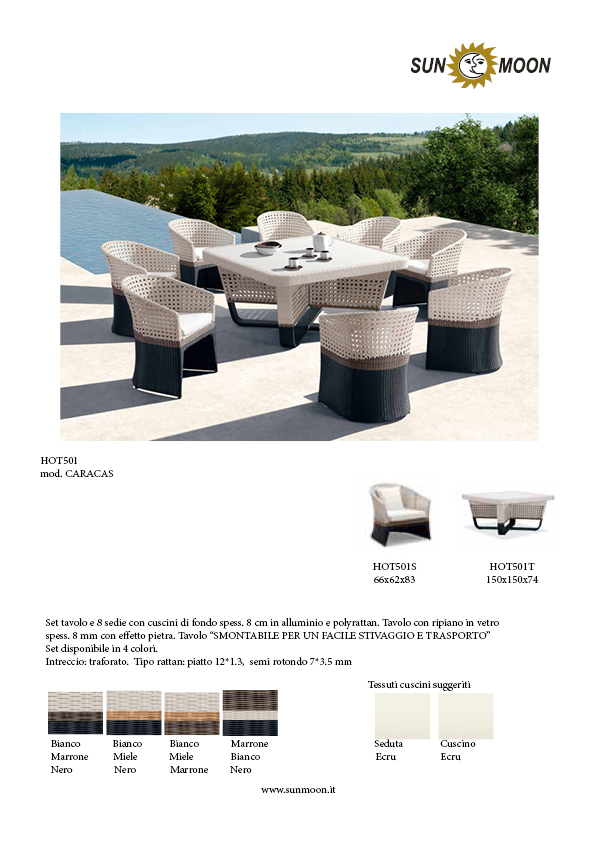 Set table and 8 chairs with thick bottom cushions. 8 cm. aluminum and polyrattan in three different colors. Table with glass top thickness. 8 mm stone effect.