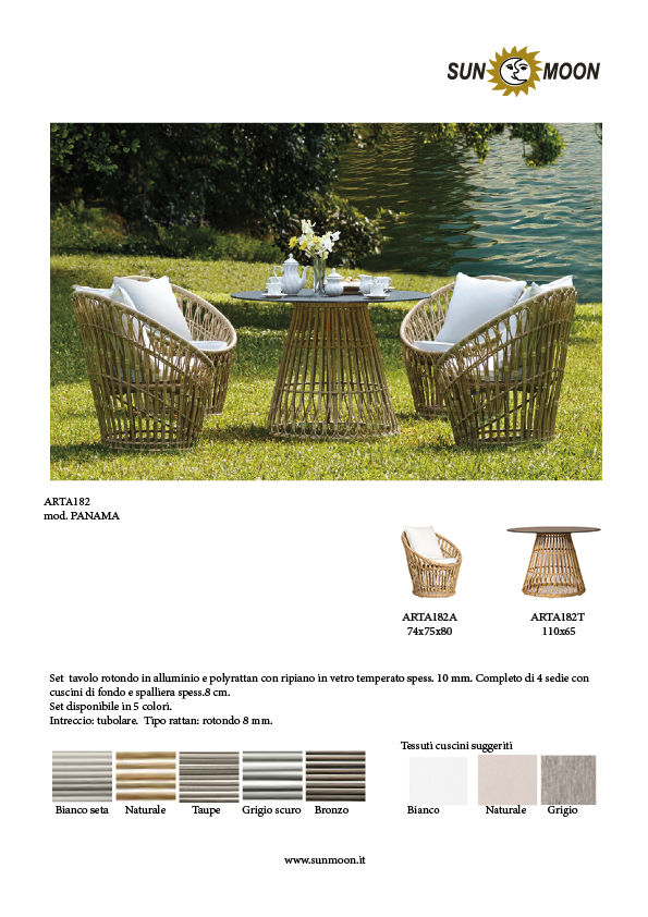 Round aluminium table sets and upholstered rattan chair with thick tempered glass shelf. 10 mm. Complete with 4 chairs with cushions and back bottom thickness 8 cm.