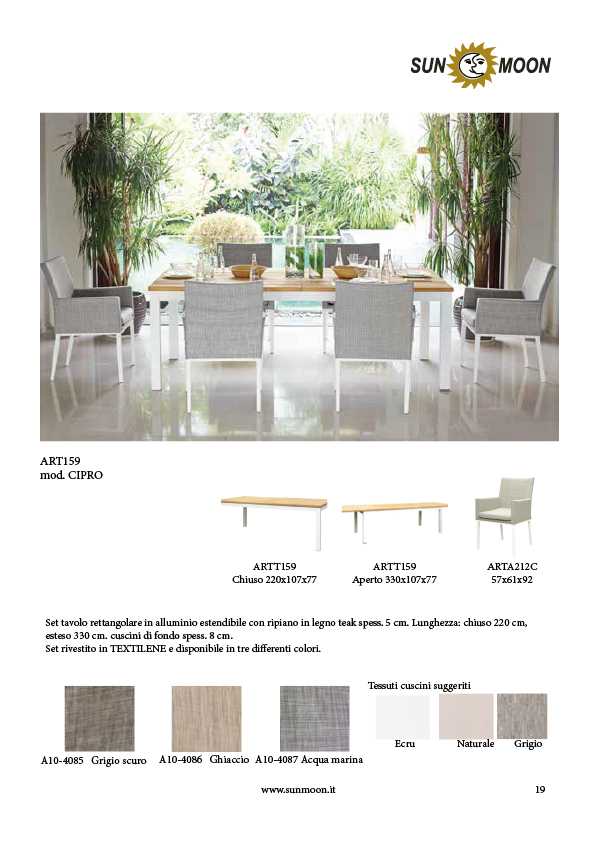 Extendable rectangular table sets made of aluminium with teak wood shelf thickness. 5 cm. Length: 220 cm closed, extended 330 cm. 6 aluminum chairs and TEXTILENE coating