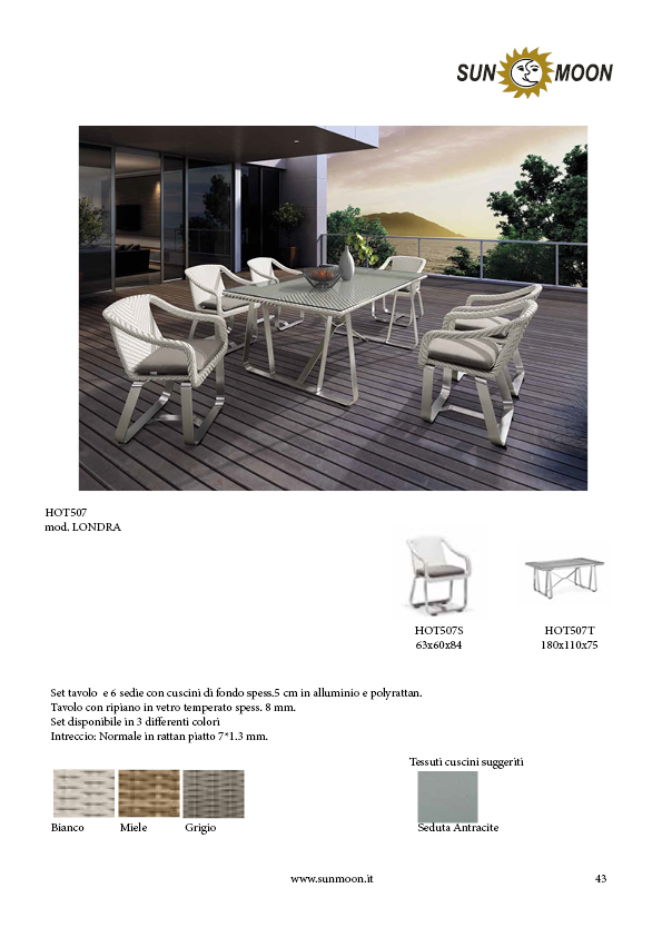 Set table and 6 chairs with thick bottom cushions. 5 cm in aluminium and polyrattan. Table with thick tempered glass shelf. 8 mm.