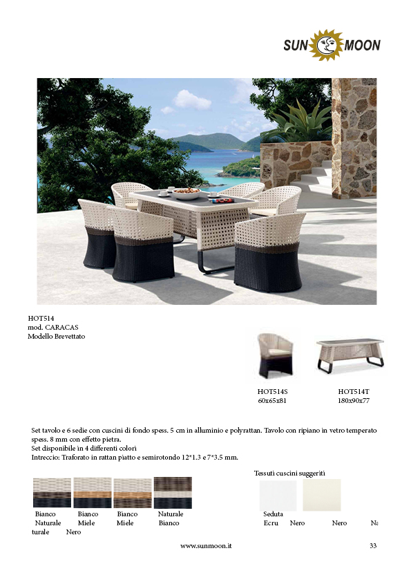 Set table and 6 chairs with thick bottom cushions. 5 cm in aluminium and polyrattan. Table with thick tempered glass shelf. 8 mm stone effect.