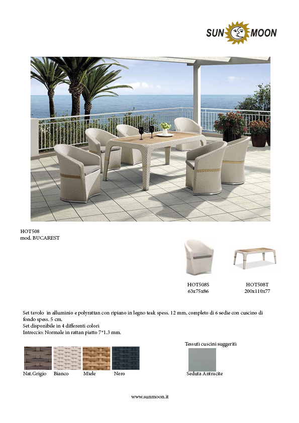 Aluminum table sets and polyrattan with shelf in teak wood thickness. 12 mm, complete with 6 chairs with thick bottom cushion. 5 cm.