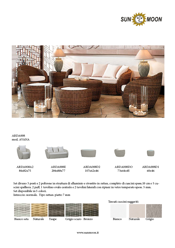 3 seater sofa set and 2 armchairs in aluminum frame and upholstered in polyrattan, complete with 10 cm thick. and 5 cushions. oval coffee table, 1 Central and 2 puff 2 side tables with tempered glass shelves thickness. 5 mm.