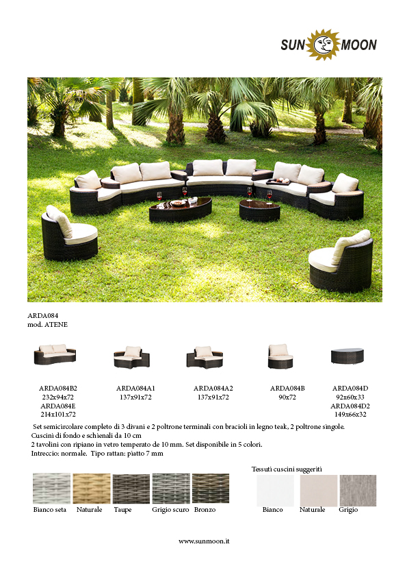 Semicircular set complete with sofas and armchairs 2 3 terminals with teak wood armrests and 2 single chairs. Thickness bottom cushions. 10 cm and use pillows back. 2 table with thick tempered glass shelf. 5 mm.