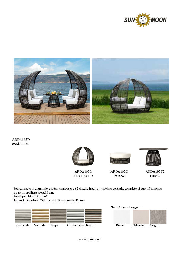 Set made of aluminium and consisting of rattan sofas and 2 1puff and 1 coffee table, complete with pillows and cushions bottom thickness. 10 cm.