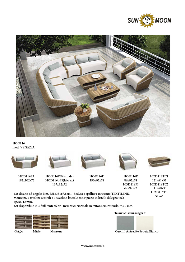 corner sofa Set size 381x381x72 cm. Seat and back made of TEXTILENE fabric. 9 loose cushions, low tables and 1 Central 2 side table with shelf in teak wood thickness 12 mm.